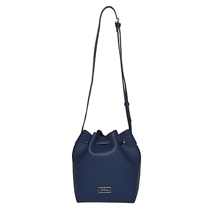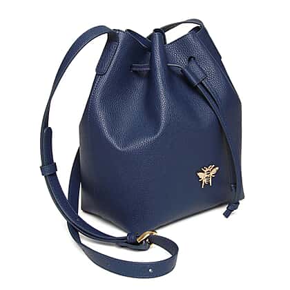 Alice Wheeler Vegan Leather Bucket Shoulder Bag with Drawstring & Bee Emblem - Navy