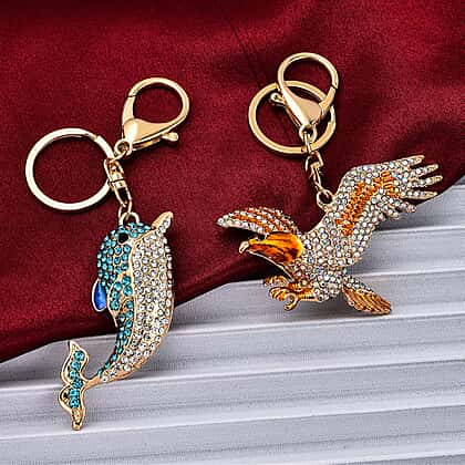Set of 2 - Multi Colour Austrian Crystal Enameled Dolphin and Eagle Keychain in Yellow Gold Tone