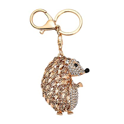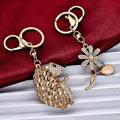 Set of 2 - Multi Colour Austrian Crystal, White Austrian Crystal and Created White Cats Eye Squirrel and Floral Keychain in Gold Tone