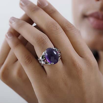 Amethysts are an otherworldly gem. They display a unique bandwidth of deep purple to violet colours that set them apart from other gems. Also known as healing stones, amethysts are known to have a calming effect on your nerves. This decorated ring features an amethyst oval that delights with its saturated violet hues against a silver backdrop. Tourmalines accent the ring's beauty with their magnificent display of colours.