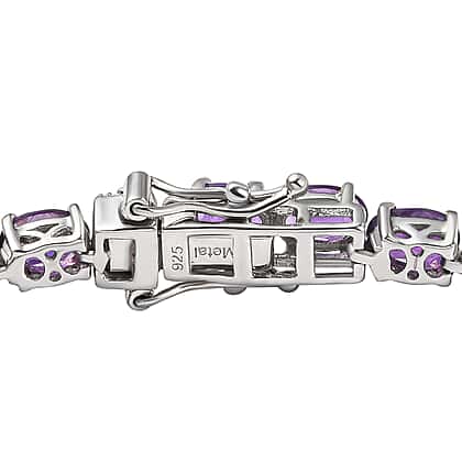 Amethyst is a semiprecious stone commonly used in jewellery and is the traditional birthstone for February. The vibrant hues of amethyst combined with the rich lustre of sterling silver give the bracelet a stunning appearance. Each oval station is enhanced by the gleaming glow of the 12.350 Ct. jewels. Each station holds the gems in place with four substantial prongs. The bracelet is meticulously cast in platinum plating, ensuring that it shines brightly. The box clasp makes it easy to put on and take off the bracelet. The high transparency of the oval-cut amethyst adds a flattering glow to the jewellery.