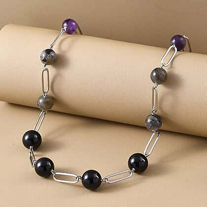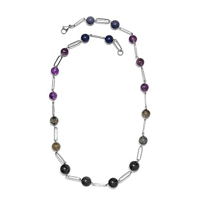 Amethyst, Lapis Lazuli, Labradorite and Boi Ploi Black Spinel Necklace (Size - 20) in Stainless Steel 92.06 Ct.