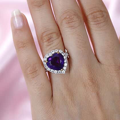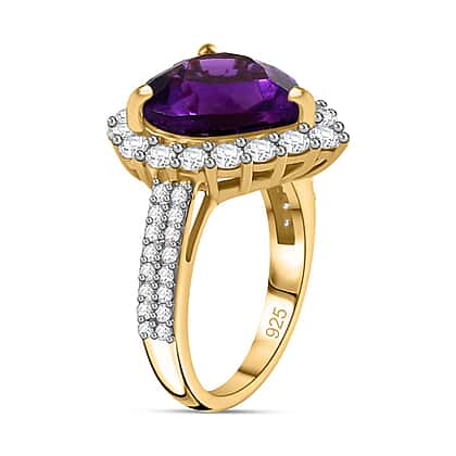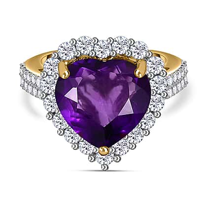 African Amethyst, White Zircon Heart Ring in 18K Vermeil Yellow Gold Plated Sterling Silver