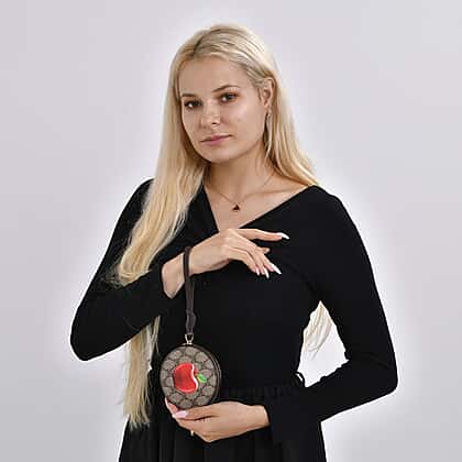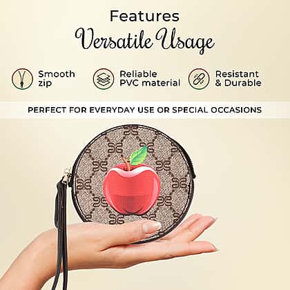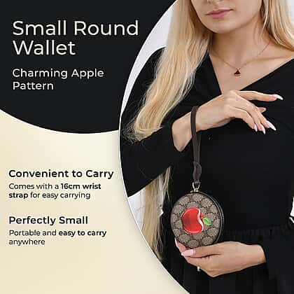 Apple Print Round Wallet with Exterior Zipped Pocket & Wrist Strap - Brown & Red