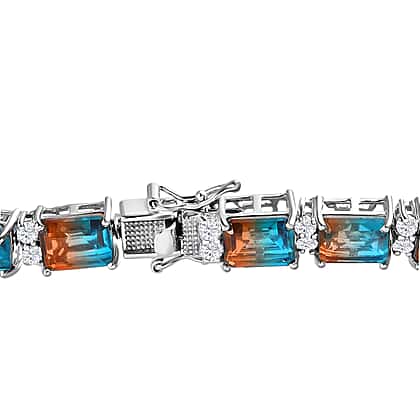 Drape your wrist in the aquatic allure of this Aqua Terra Costa quartz cluster bracelet. Each link is a canvas displaying the unique, harmonious blend of sea blues and sunset oranges of the quartz, accented with the sparkle of white zircon. This exquisite bracelet in platinum overlay sterling silver is a symphony of colour that brings the beauty of a coastal paradise to your ensemble.