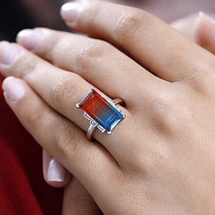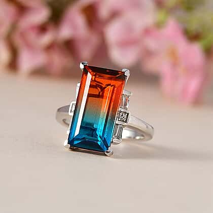 Embrace the enchanting beauty of the ocean's depths with this Aqua Terra Costa quartz ring. Laced with white topaz on the sides, this elongated ring features stunning quartz, reflecting the warm sunset hues cascading into cool ocean blues. Set in platinum overlay sterling silver, the unique design of this ring makes it ideal for those who love bold and beautiful. Pair it with a bold black dress to leave a lasting impression.