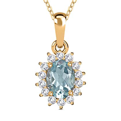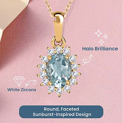 Aquamarine March Birthstone and Natural Zircon Halo Pendant with Chain (size 20) in 18K Vermeil Yellow Gold Plated Sterling Silver