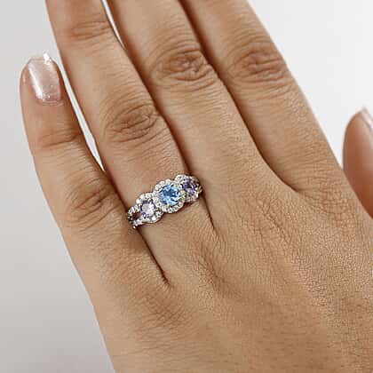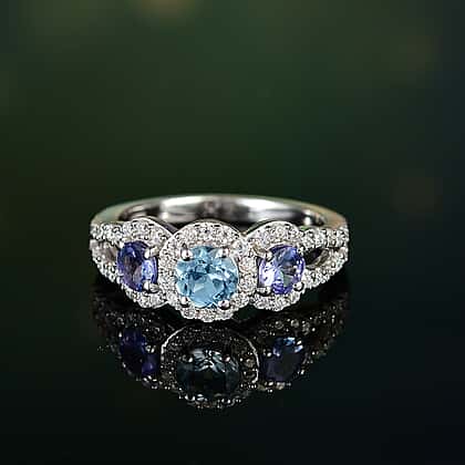 Aquamarine, Moissanite & Tanzanite Ring in Rhodium Overlay Sterling Silver 1.57 Ct.