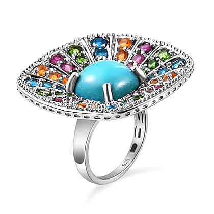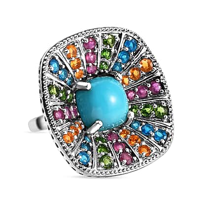 Arizona Sleeping Beauty Turquoise and Multi Gemstones Cocktail Ring in Platinum Plated Sterling Silver 8.03 Ct, Silver Wt. 9.00 Gms