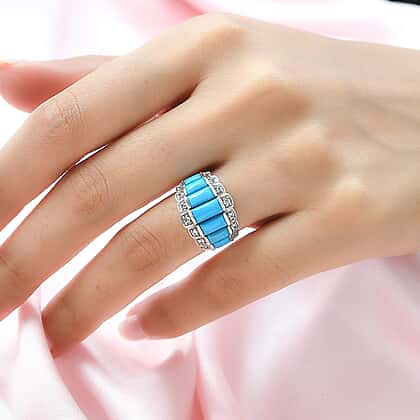 This Arizona Sleeping Beauty turquoise ring will brighten any look with the sky-blue hues that inspire hope! The ring features baguette-shaped Arizona Sleeping Beauty turquoise in graduating fashion with the largest gem positioned in the middle in a channel setting. Influenced by the vast fields of morning glory flowers, the ring has studded Cambodian zircons in four-prong setting on the outline creating mesmerizing pattern. Designed with sterling silver, the ring has a smooth and well-polished exterior that ensures comfortable wear. Glam up your ensemble with this ring that is sure to leave a mark.