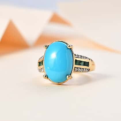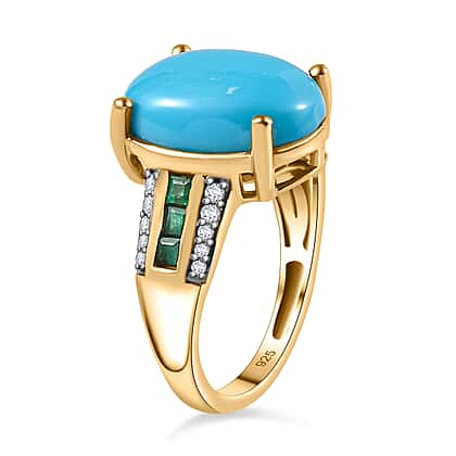 Arizona Sleeping Beauty Turquoise, Moissanite and Zambian Emerald Ring in 18K Vermeil Yellow Gold Plated Sterling Silver 5.35 Ct