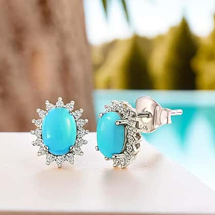 Arizona Sleeping Beauty Turquoise December Birthstone Halo Stud Earrings with Cambodian Zircon in Platinum Overlay Sterling Silver
