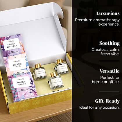 Create a serene space with the Botanical Bliss Aromatherapy Gift Set, featuring French Lavender, Orchid Flower, and English Rose fragrances. This set includes three elegant 50ml reed diffusers and three 20g fragrance sachets, blending calming, romantic, and exotic aromas to suit any mood or moment. Designed to complement your décor, the chic packaging adds a luxurious touch to any setting. Ideal for use in wardrobes, drawers, or open spaces at home or work, this gift-ready set offers a stylish way to refresh your environment. A thoughtful present or a treat for yourself, it’s your daily dose of tranquillity and elegance.