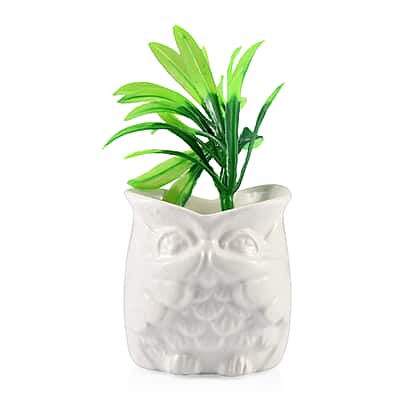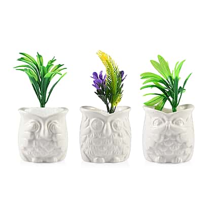 Home Decor - Set of 3 - Artificial Mini Plants in Ceramic Owl Pots (Size 6x4.5 Cm) - White