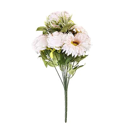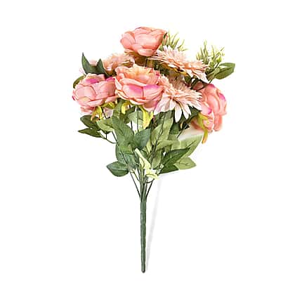 Set of 2 Artifical Rose and Sunflower with 20 Heads, Green Stem, Grass - Leaves - Pink - White