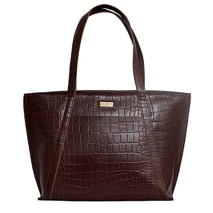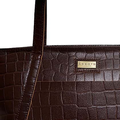 Assots London AGNES Croc Embossed Genuine Leather Tote Bag with Zipper Closure (Size 42 x 28 x 10.5) - Brown
