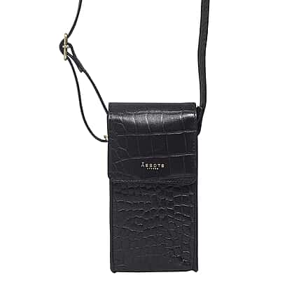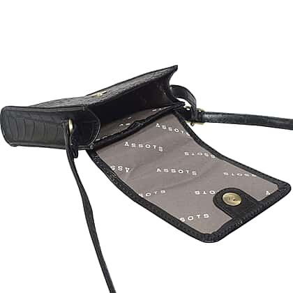 Assots London Tracy 100% Genuine Leather Croc Pattern Mobile Crossbody Bag with Shoulder Strap - Black