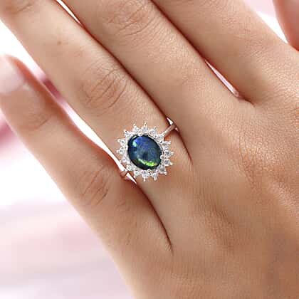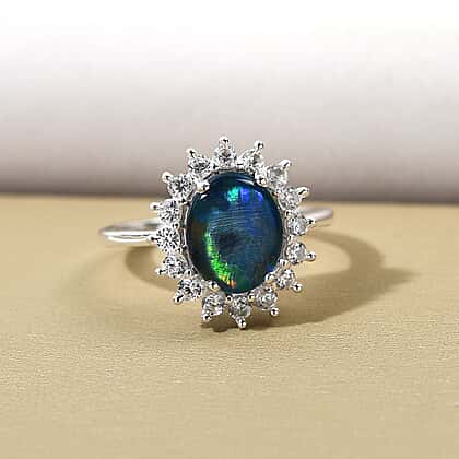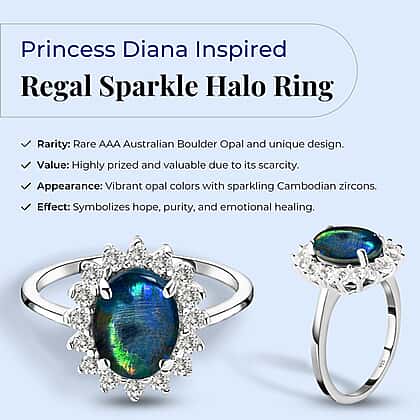 Rare AAA Australian Boulder Opal with Cambodian Zircon Princess Diana Inspired Halo Ring in Sterling Silver 2.56 Ct.