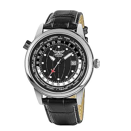AVIATOR F Series World Timer Water Resistant Gents Pilot Watch With Black Leather Strap - 45mm Case - Black