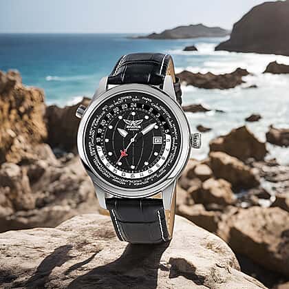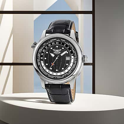 Time takes a sophisticated turn with the AVIATOR Gents Pilot Watch. A striking blueberry dial within a robust 45mm case sets the stage for impeccable style. Navigating time zones becomes effortless with its world time feature, while the blue-calf leather strap ensures comfort with flair. Water resistant up to 3 ATM, this timepiece symbolises luxury and an emblem of resilience.