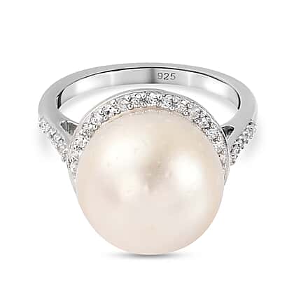 Beirut Pearl and Zircons Halo Ring in Platinum Plated Sterling Silver