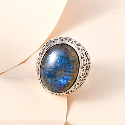 Bali Closeout - Labradorite Solitaire Ring in Platinum Overlay Sterling Silver 17.55 Ct, Silver Wt. 7.48 Gms.