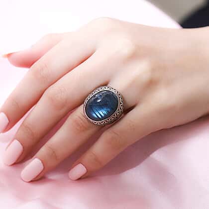 This labradorite solitaire ring is a perfect exhibition of magic and elegance. This solitaire ring's bold and enchanting look will create a prominent effect on your pretty finger and give you an option for jewellery to be adorned daily. Crafted in solid 925 sterling silver, The reverse tapered style shank makes the centre stone appear larger than life. The vintage design of this ring features beautiful metalwork on the shank, celebrating the magical play of colours exuded by the oval cabochon-cut labradorite. The natural vibrancy and labradorescence of this gemstone will create a unique hue with each attire you carry it with.