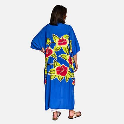 Bali Collection - 100% Viscose Handpainted Floral Pattern Kimono (One Size) - Blue