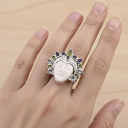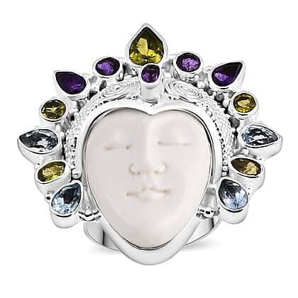 Displaying a stunning ring that features a smooth and hand-carved ox bone face framed by a bright mix of Peridot, Swiss Blue Topaz and African Amethyst. The gemstones create a vivid halo around the central carving, adding colour and depth to the bold sterling silver setting. Crafted in hypoallergenic 925 sterling silver, this ring offers durability and an enduring shine while remaining comfortable for sensitive skin. Designed to stand out, the piece blends cultural influences with artistic detail, making it ideal for those who enjoy expressive, meaningful jewellery with strong personality and craftsmanship.