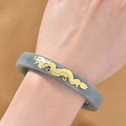 This jadeite bangle strikes a perfect balance of tradition and high-fashion. This sculpted piece made from serene green jade is adorned with a luminous gold dragon motif. The polished silhouette wraps the wrist in a single, unbroken band. It's smooth and features an intricately detailed golden dragon that lends a fierce modern allure to the design. Each glance reveals the interplay of earthy jadeite and radiant gold, creating a wrist statement that is both serene and fiercely symbolic. It makes a great choice for those looking for pieces that are bold and usher a natural allure.