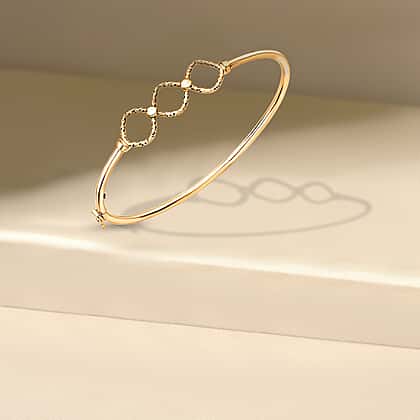 This exquisite bangle comes in a diamond cut triple square design, which makes it highly exclusive as the diamond cut gives the bangle extra shine and lends it a classy look. It is made from 9K yellow gold, making it an extremely sophisticated yet chic Bangle according to contemporary world trends. It weighs 3.7 grams and comes with a box clasp, making it lightweight and comfortable to wear quickly. You can style this bangle with many outfits, whether it is a formal outfit, casual outfit or dresses and more.