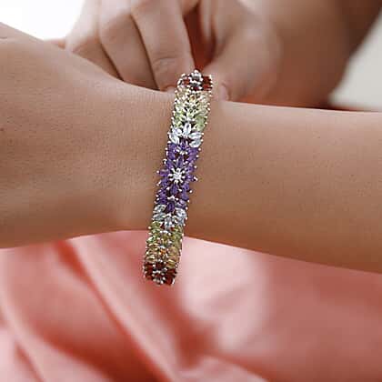The bangle is studded with amethyst and multi-colour gemstones in marquise cabochon cut to create flower petals. It features petal-shaped gemstones cascading with a prong setting in the centre in platinum-plated sterling silver. The bangle is designed in durable and hypoallergenic metal. It is crafted from 925 sterling silver with a platinum overlay and a lock to secure the fit on your wrist. You can pair it with your floral dresses to complement the look of your outfit.