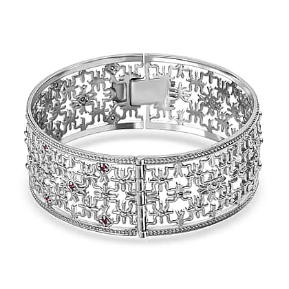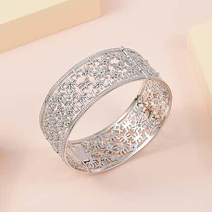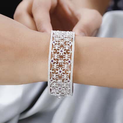 This Foilback Amethyst Crystal Bangle is a beautiful, long-lasting, and affordable piece of jewellery. Carrying the soothing aura of amethysts, it features an intricate design inspired by royal jewellery. The bangle, crafted from durable and sturdy brass, is finished in silver tone for a sparkling finish. The latticed look of the bangle coupled with its wide rim, lends it a very bold and festive appeal.