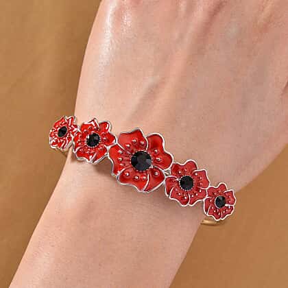 Red poppy flowers imagined in red enamel and black Austrian crystals can remind you of wild and wonderful flowers oozing a heady perfume that lingers in the air. Crafted in pure alloy, polished in silver tone, this cuff bangle comes in open-style design. It features romantic red enamel poppies accented with deep black crystals at the centre. The open-cuff style sits comfortably on the wrist and entails metallic beads at ends that helps add a graceful, endearing look to the design. Poppy flowers in red hue can symbolise sacrifice and remembrance, thus it makes a great choice for those who are grieving a loss of their loved one. It's just a pretty bracelet that will always remind you of their love.