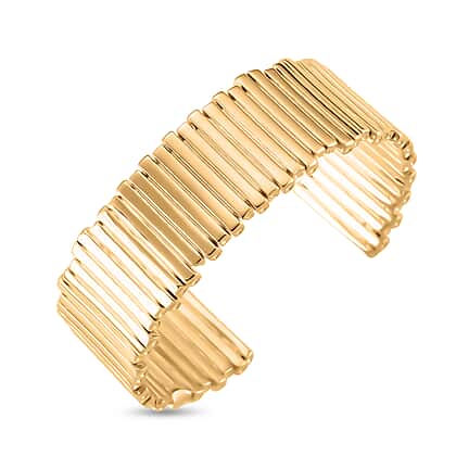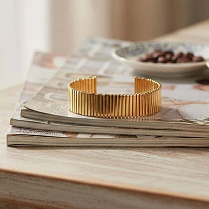 There is something irresistible about this designer-inspired cuff bangle. It features a continuous row of vertical ridged bars that helps add a sense of length to the design and lends it a bold appeal. Crafted in pure brass, polished in yellow gold tone, this bracelet catches light beautifully and makes for a fashion-forward piece. Its open cuff style ensures a comfortable wear along with a strong visual impact. Style it with a plain white shirt or black LBD to add an architectural allure to your look.