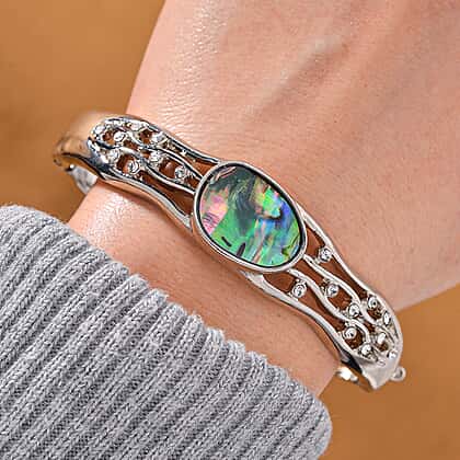 - This bangle features a stunning abalone shell centrepiece, renowned for its shifting colours that mimic the ocean