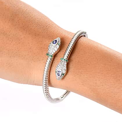 D'Joy Tanzanite, White Zircon, Zambian Emerald Bangle (Size 7.5) in Rhodium Overlay Sterling Silver 2.53 Ct, Silver Wt. 23.05 Gms.