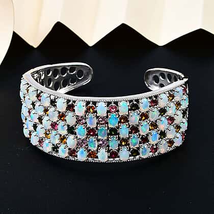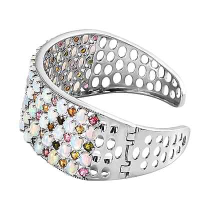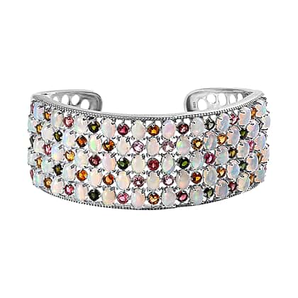 Ethiopian Welo Opal and Multi-Tourmaline Cuff Bangle (Size - 7.5) in Platinum Overlay Sterling Silver 22.28 Ct, Silver Wt. 33.50 Gms.