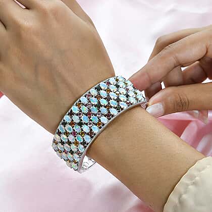 Create a solid look to match your attire with this Ethiopian welo opal and multi-tourmaline cuff bangle, and let there be applauses everywhere around you. The superb design of this opal and tourmaline cuff bangle is crafted by experienced artisans in sterling silver, creating pronged surfaces for each gemstone piece. The cabochon cut welo opals make their magical play of colours on your wrist, along with the support of multi-coloured tourmaline, set simultaneously on this cuff bangle. You can wear this cuff bangle alone or pair it with your favourite bracelet.