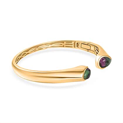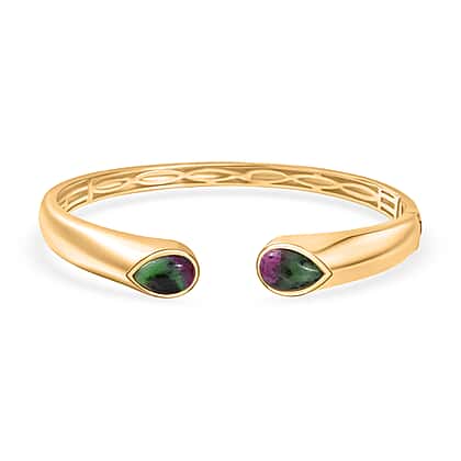 Add a luxurious touch to your wrist by adorning it with a sleek EverTrue natural ruby zoisite bangle. This open style bangle features two pear-shaped ruby zoisite stones set at each end, each blending deep green and red toned hues. The smooth yellow gold plated band has a fluid, tapered shape that gives the piece a refined, contemporary look. Inside, a subtle lattice pattern adds an artistic touch.