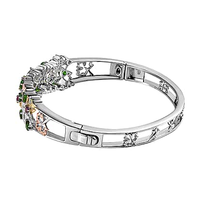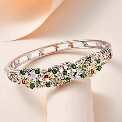 GP Maple Leaf Collection - Natural Chrome Diopside & Multi Gemstone Bangle (Size 7.5) in Two-Tone Plated Sterling Silver 3.65 Ct, Silver Wt. 25.80 Gms