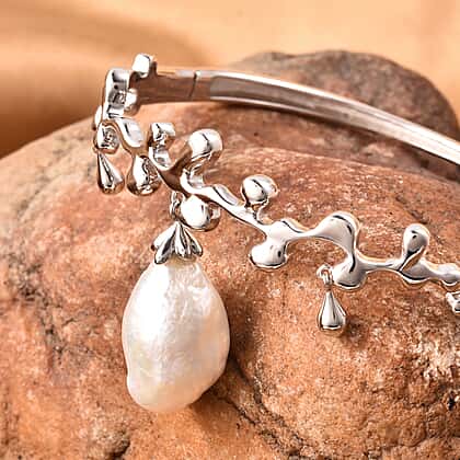 Lucy Q Baroque Freshwater White Pearl Splash and Drip Design Bangle (Size 7.5) in Rhodium Overlay Sterling Silver, Silver Wt 21.17 Gms