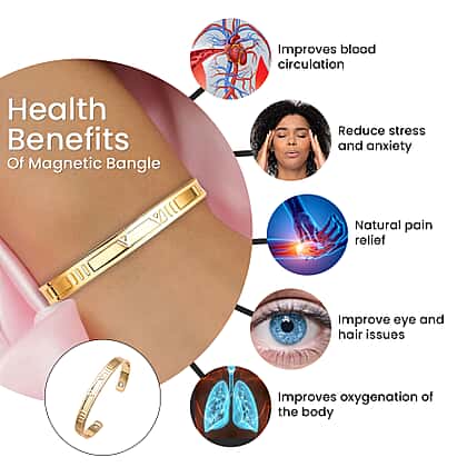 Adorn this magnetic numeric cuff bangle and stand out from the crowd. This elegant bangle features a yellow gold-tone plating and numeric design engraved on it, with wide-rounded ends to hold the magnet. It is said to give magnetic therapy and is believed to relieve pain, stress, and anxiety, improve blood circulation, provide natural pain relief and improve your oxygen level. A uniquely designed cuff bangle to help you start the stress and anxiety and keep you fresh and relieved.