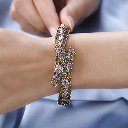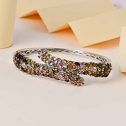 Multi-Tourmaline Bangle (Size - 7.5) with Spring Lock in Platinum Overlay Sterling Silver 15.16 Ct, Silver Wt. 31.25 Gms