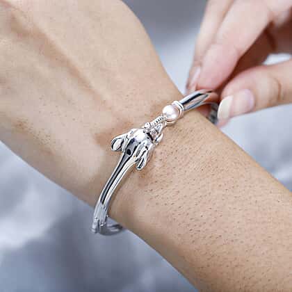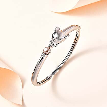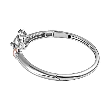 Pink Fresh Water Pearl Elephant Bangle (Size 7.5) in Silver Tone