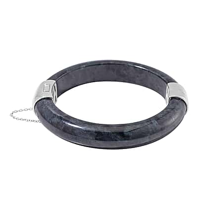RARE OPPORTUNITY - Natural Black Jadeite Jade Bangle (Size 7.5) in Rhodium Overlay Sterling Silver 250.00 Ct