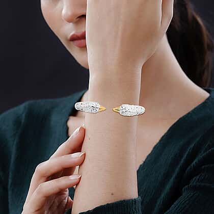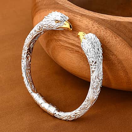 Exuding elegance and artistry, this sterling silver & yellow gold plated cuff bangle features a striking eagle-inspired design that symbolises strength, courage, and freedom. Meticulously crafted, the textured detailing along the eagle motifs brings a lifelike quality, while the yellow gold-plated accents on the eagle heads add a touch of luxury and sophistication. The intricately etched silver band enhances the craftsmanship, showcasing ornate patterns that reflect exceptional attention to detail. Designed with a hinge mechanism to offer ease of wearing, this cuff bangle is a timeless statement of refined elegance, perfect for special occasions and everyday wear.
