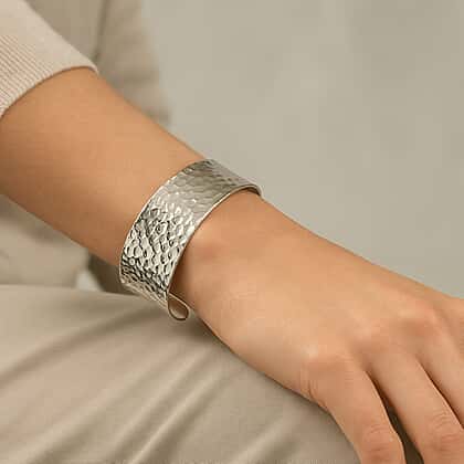 Make a bold statement with the royal Bali collection handmade hammered cuff bangle, a perfect fusion of refined beauty and exceptional craftsmanship. Meticulously crafted in 925 sterling silver, this piece ensures durability and offers enduring shine with a polished finish. This cuff features a distinctive hammered texture that adds character and charm. The substantial feel of the bangle offers a striking presence while remaining comfortable for all-day wear. With its unique, handmade finish, it combines modern design with traditional craftsmanship, making it a standout accessory for any occasion. Ideal for complementing both casual and formal outfits.