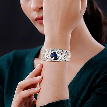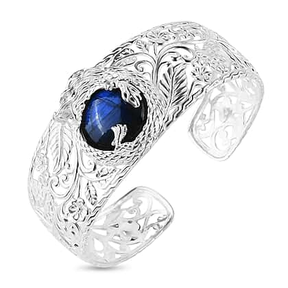 This artistically crafted labradorite dragon cuff bangle by the Royal Bali Collection is a striking statement piece that beautifully blends artistry and symbolism. Intricately hand-carved, the cuff features an ornate dragon motif curling around a labradorite gemstone, admired for its enchanting flashes of blue and green. The sterling silver setting is hypoallergenic, tarnish-resistant, and comfortable for daily wear. Dragons represent strength and protection, while labradorite is celebrated for its mystical energy and transformative power. Adjustable for a perfect fit, this bangle is both meaningful and versatile, making it a unique treasure for your jewellery collection.