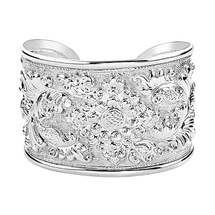 Experience the exceptional craftsmanship and artistry with the Royal Bali Collection cuff bangles. This mesmerising bangle features delicate and intricate floral-inspired designs, a perfect reflection of Balinese craftsmanship. Meticulously crafted in hypoallergenic 925 sterling silver, this piece offers durability and enduring shine with comfort to sensitive skin. The wide cuff pattern makes it a standout addition to your jewellery collection, a perfect piece for special evening outfits and special occasions. Add a touch of heritage beauty to your outfit with this handmade cuff bangle.